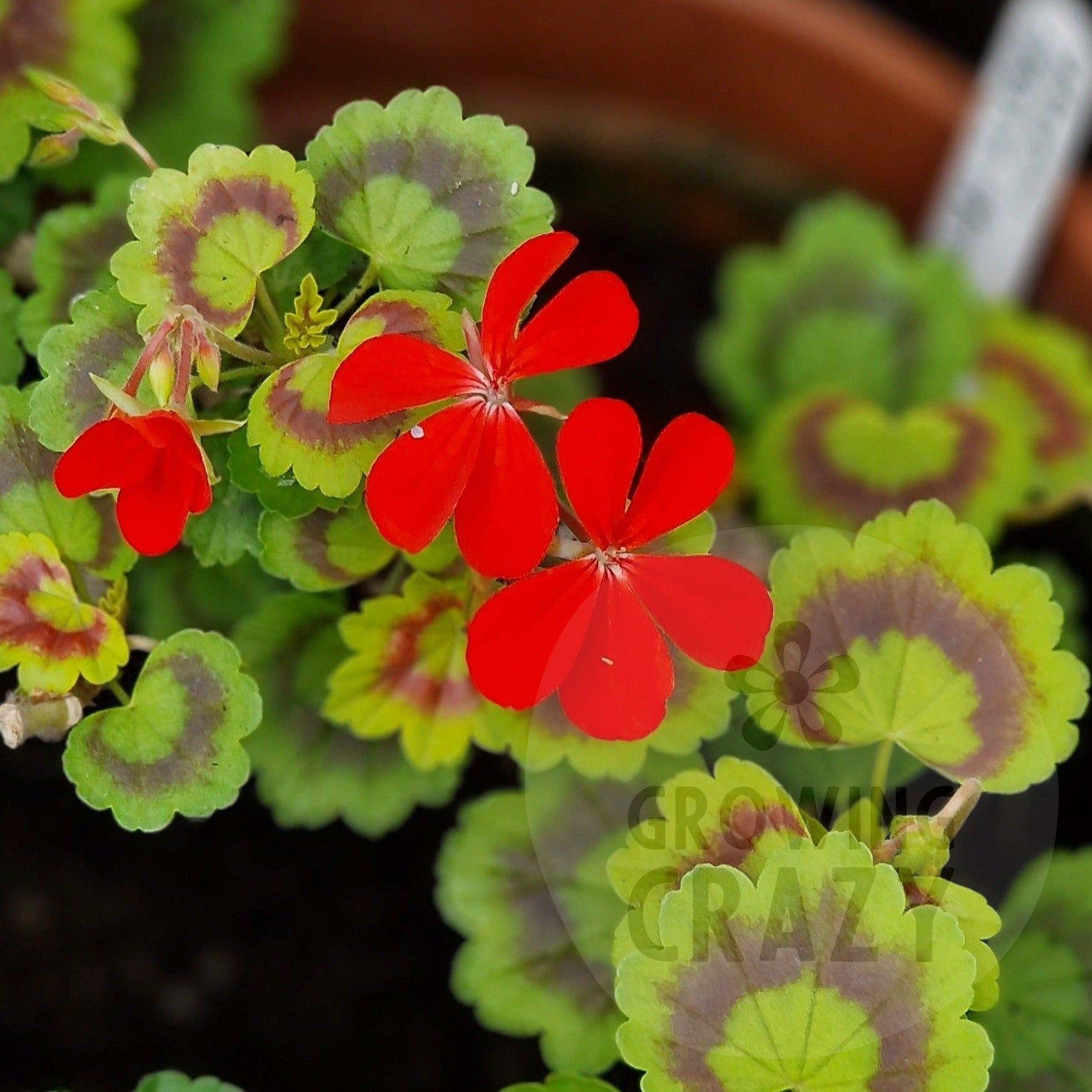 This fancy leaved pelargonium has lovely golden leaves with a dark zoning and produces single bright scarlet red flowers.