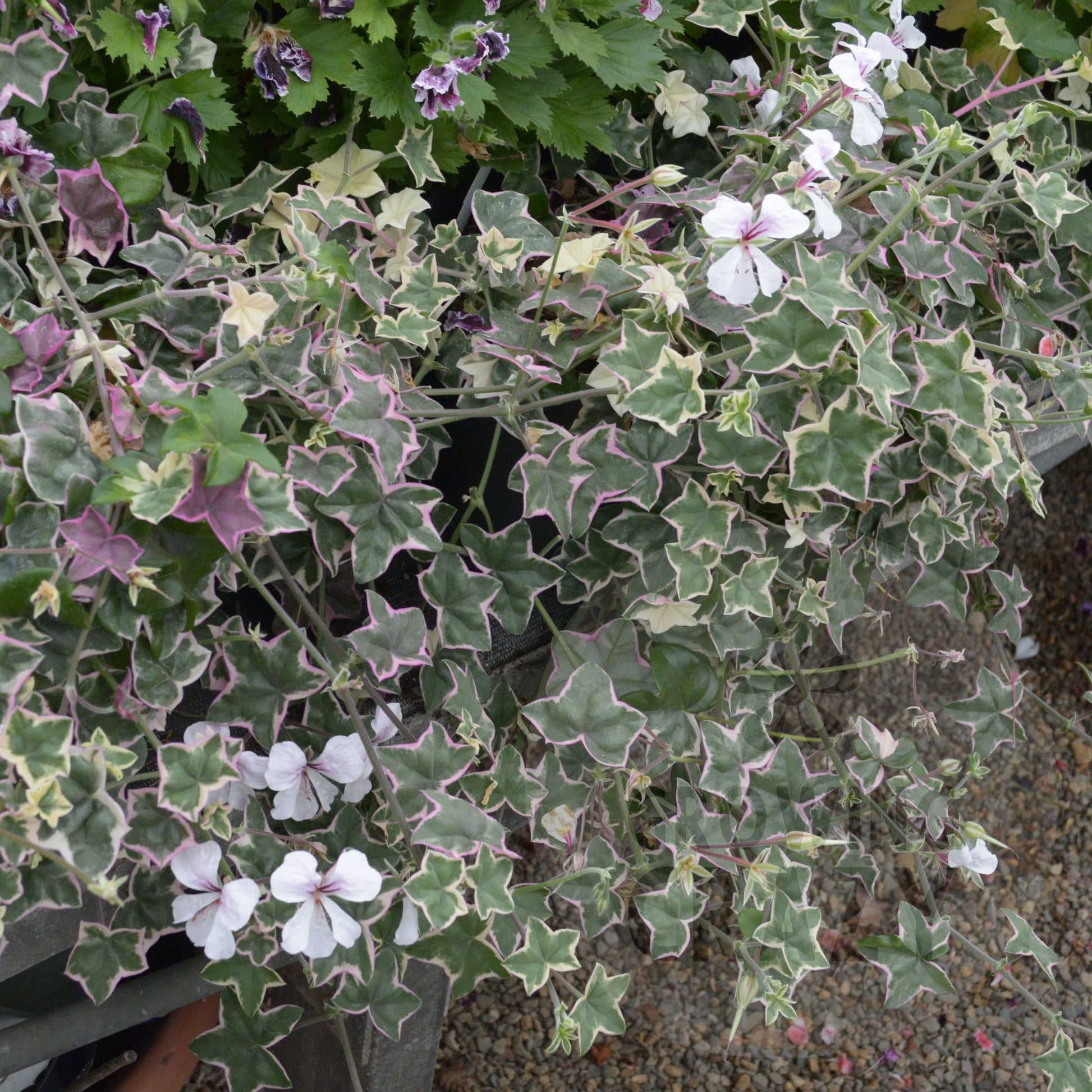 This ivy leaved variety is a real favourite for the foliage cascading down the sides of patio pots - the flowers are a bonus! This variety has green leaves with a white silver edge which also turns purple with full sun.