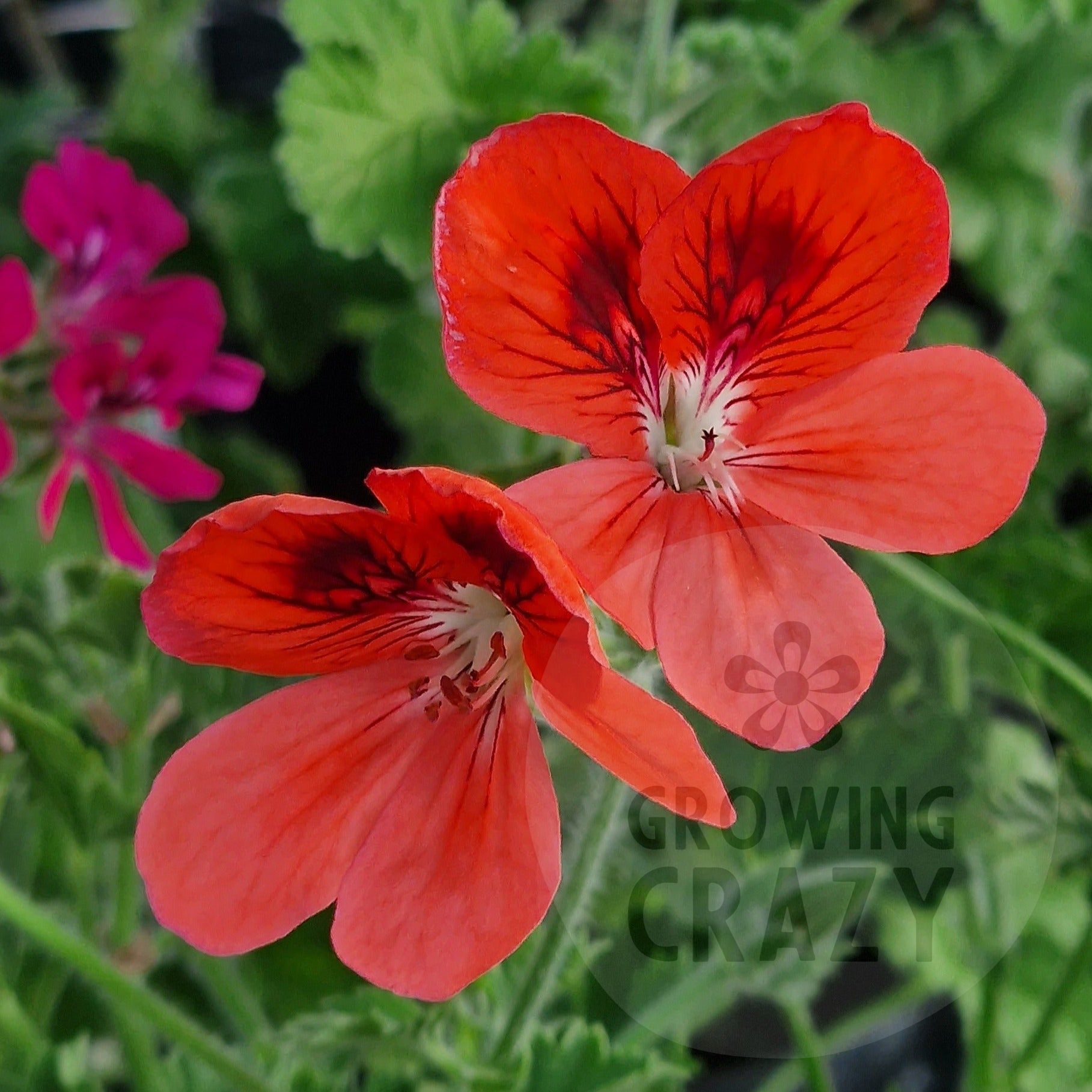 Polka is a Unique Pelargonium that produces striking orange flowers that are flushed with black feathering on the upper petals. The plant has a compact and spreading habit with foliage of lime green which makes the flowers really stand out.