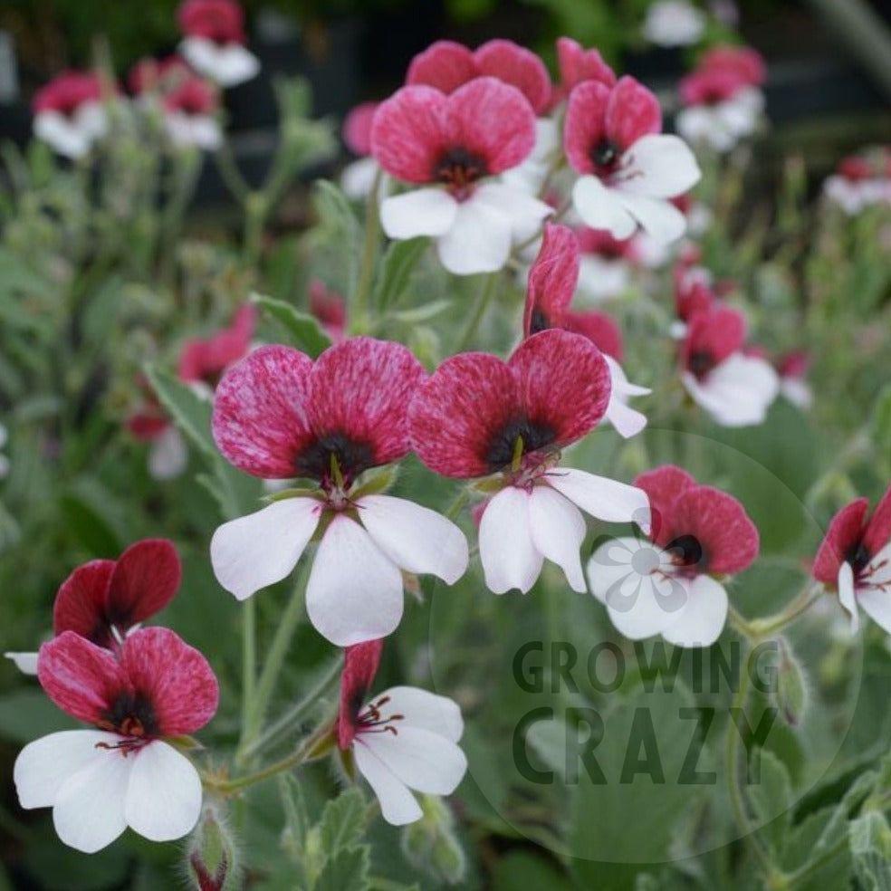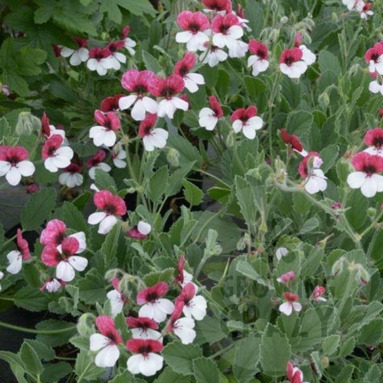 Flowers of red upper petals with a dark centre and almost white lower petals. Delicate grey/green ovate foliage. Prostrate habit.