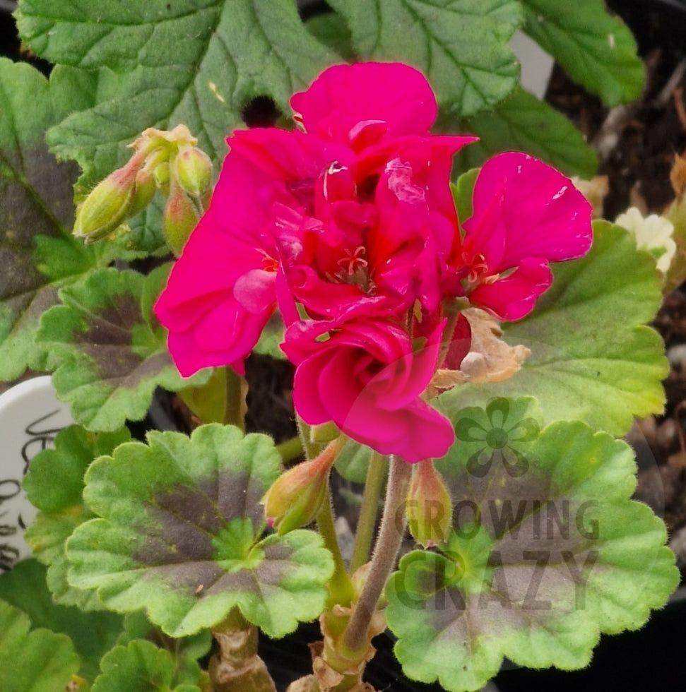 This double Zonal Pelargonium has beautiful purple flowers but it's the dark green leaves with a large purple-black medallion zone in its centre that contrasts with the flower that makes this plant so interesting.